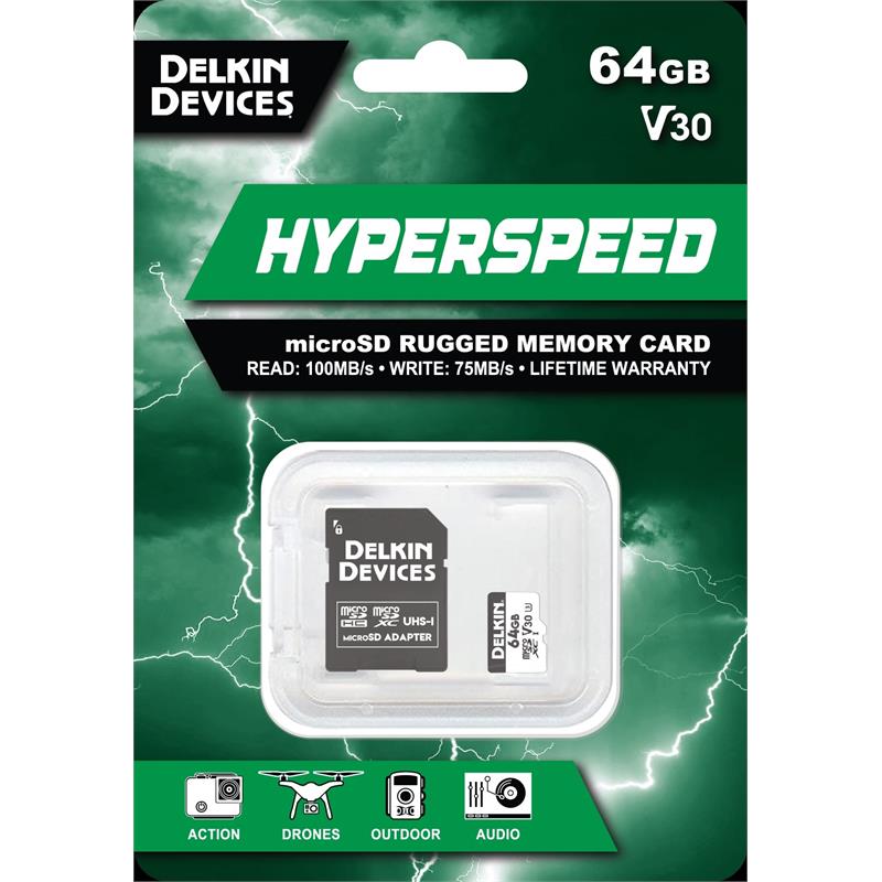 Optimized to excel in action cameras, drones, GPS units and other mobile devices, the 64GB Hyperspeed UHS-I SDXC Memory Card from Delkin Devices features a storage capacity of 64GB and takes advantage of the UHS-I bus to support maximum read speeds of 100 MB/s and maximum write speeds of 75 MB/s. This card has also been designed with the V30 Video Speed Class and U3 ratings, which guarantee minimum write speeds of at least 30 MB/s. All of this allows for users to capture 4K, Full HD, HDR (High Dynamic Range), and HFR (High Frame Rate) video. It also supports raw and JPEG photo captures, rapid-fire photo bursts, time-lapse, and more.