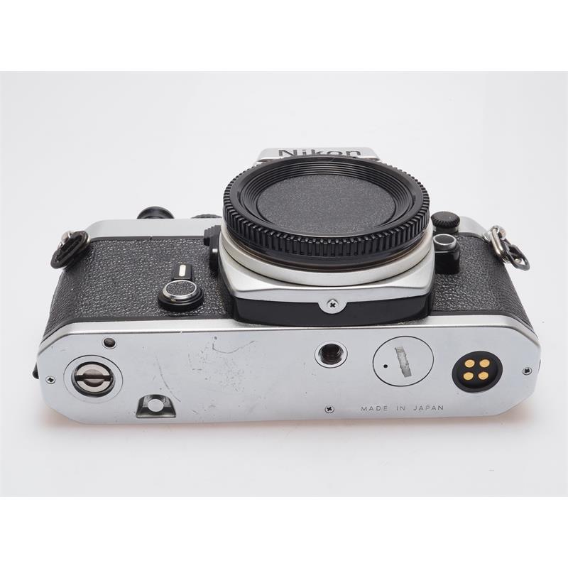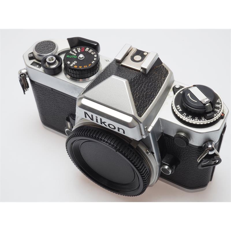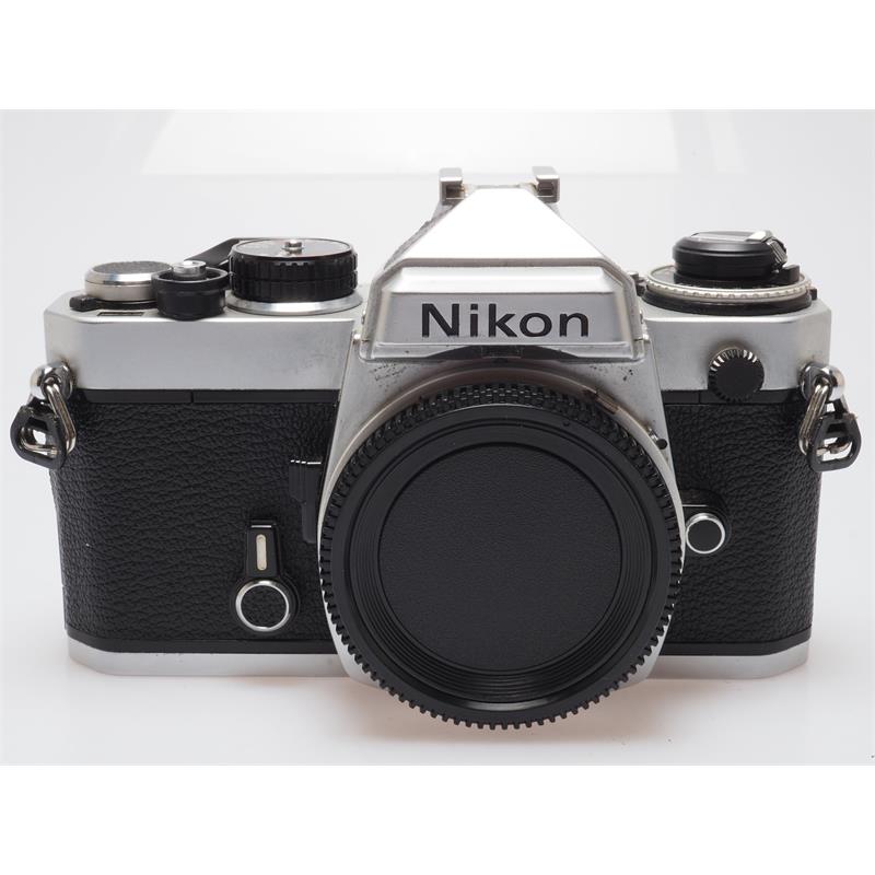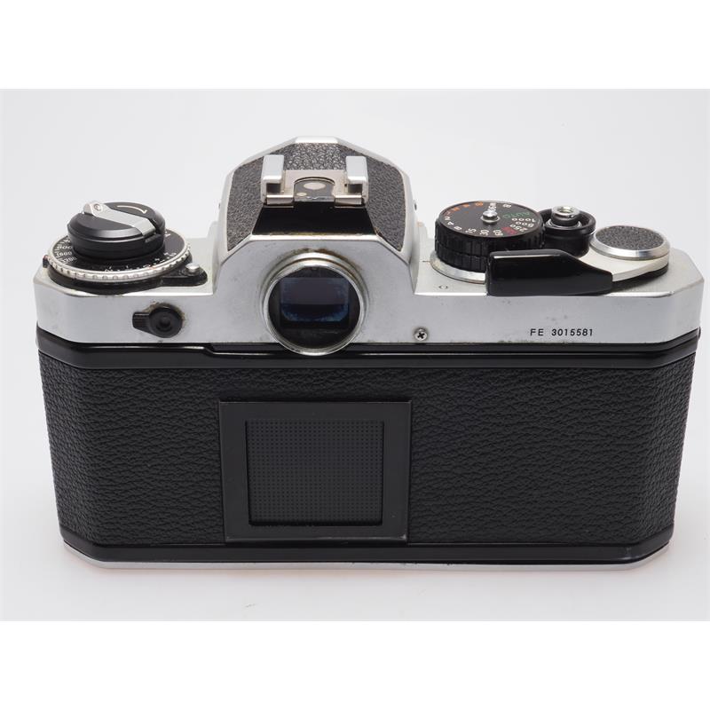 Released in 1978, the FE is a manual-focus SLR with manual exposure control or aperture-priority autoexposure, and electromechanical components. It also incorporates the "match-needle" exposure control system. This consists of two needles pointing along a vertical shutter speed scale on the left side of the viewfinder. In manual mode, a black needle points out the shutter speed recommended by the built-in, open aperture, through-the-lens (TTL), silicon photodiode (SPD) light meter, with 60/40 percent centerweighting, while a translucent green needle shows the actual camera-set shutter speed. The photographer adjusts the shutter speed and/or the lens aperture f-stop until the needles align. Extremely hard-wearing, the chassis of the FE became the basis of most of the F-series cameras until 2006. Camera Type: Single Lens Reflex camera Film Size: 35mm Lens mount: F Mount AF: no Film Rewind: manual Flash: external Power Source: 2 x LR44/SR44 battery Dimensions (mm): 142 x 89.5 x 57.5 Weight (g): 590