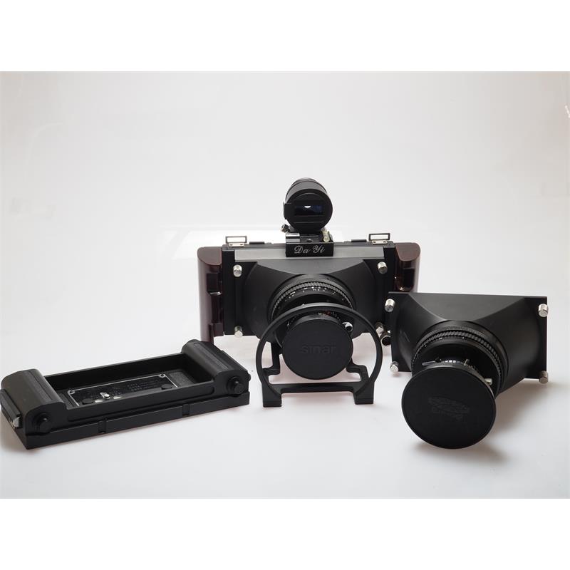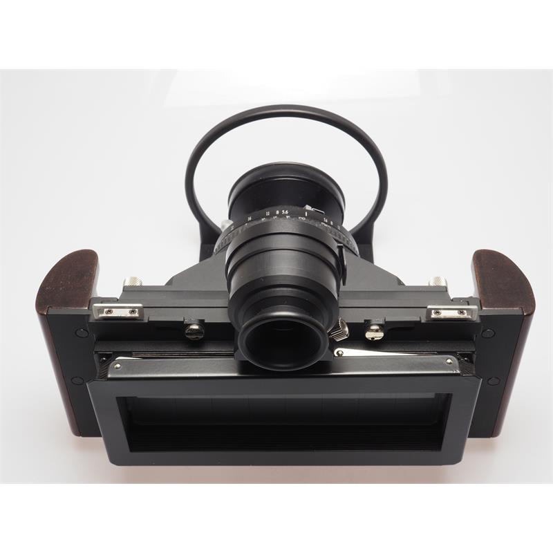 With 90mm f8, 120mm f8 lenses, 90mm viewfinder, roll film hoder and case.