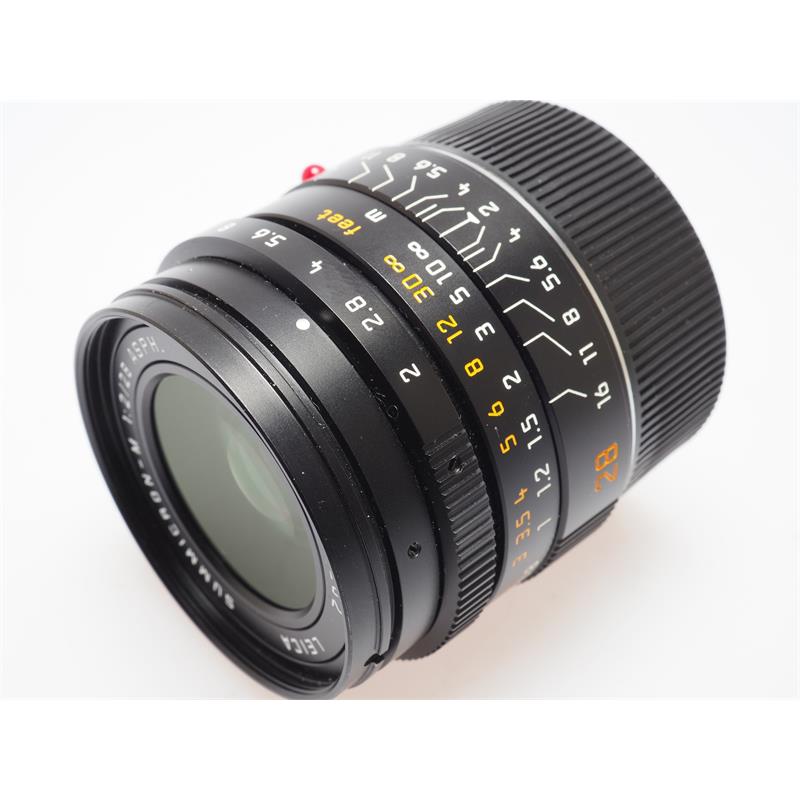 To give the "M" system even greater versatility in difficult light situations, the popular Leica Summicron-M 28mm f/2.0 Aspherical Lens (6-bit, manual focus) has a focal length with an even faster speed of others in the line of Leica Summicron high speed lenses. By means of a complex optical computation, the use of special types of optical glasses and the inclusion of a lens element with an aspherical surface, it has been possible to create a lens with outstanding performance that is in no way below that of the excellent performance of the Elmarit-M 28 f/2.8. Considering the fact that this lens is one stop faster than the 28 f/2.8, it is remarkable that the designers were able to keep the dimensions and weight of the new lens virtually the same as the old lens. This lens features outstanding image performance across the entire field, high resolving power and brilliance even at maximum aperture. This lens has been updated with the "6-bit" coding, which allows the digital M camera to read this information optically and to identify which lens is being used. The camera can then (optionally) apply a "final stage" software based vignetting correction (for RAW images the lens used is simply recorded, no change is made). Focal Length: 28mm Aperture: Maximum: F2, Minimum: F16 Camera Mount: Leica M Minimum Focus Distance: 0.7m Elements/Groups: 6/9 Filter Thread: 46mm Weight: 272g Dimensions: 41x54mm