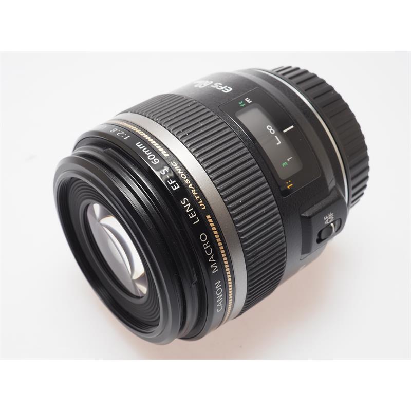 The EF-S 60mm F2.8 Macro USM Lens from Canon is a telephoto prime lens and the first true macro lens of their EF-S series, made specifically for "APS-C" format Canon SLR cameras. It produces 1:1 magnification for extremely detailed close-up images and with a 35mm focal length equivalence of 96mm, it is also ideal for medium telephoto applications including portraiture. Its maximum aperture of f/2.8 is effective in low light and offers shallow depth of field control. Autofocus is achieved with Canon's very best ring-type ultrasonic (USM) motor, which is fast and silent and allows you to manually override the focus at any time without switching the camera's focus mode settings. The field of focus is flat, important in macro work, and the aperture diaphragm is circular to allow more natural background highlights. An internal focusing system prevents the lens' extension while focusing and a three-group floating element lens design results in excellent delineation at all focusing distances from life size macro to infinity. Canon's Super Spectra lens coatings suppress ghosting and flare and an optional lens hood (ET-67B) further reduces the incidence of flare. Lens Type: Macro Prime Focal length - wide (mm): 60 Focal length - tele (mm): 60 Max aperture – wide: 2.8 Max aperture – tele: 2.8 Minimum aperture: 32 Minimum focus distance (m): 0.2 Image stabilization: No Sensor format: APS-C size Lens mount: Canon EF-S Lens elements: 12 Lens groups: 8 Aperture blades: 7 Filter thread (mm): 52 Enlargement Ratio: 1:1.0 Autofocus motor: USM MF switch: Yes Size: 73 x 69.8 mm Weight (g): 335